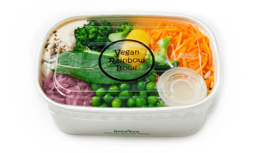 Vegan Rainbow Salad: Mixed quinoa, pickled red onion,brown rice, shredded red & white cabbage, carrot, peas, mint, hummus, broccoli florets, toasted seeds,lemon wedge & French dressing. Contains Sesame Seeds. Serving Size: 397g. Store at: Store Refrigerated at or Below 5 degrees celcius. Shelf Life: 3 days