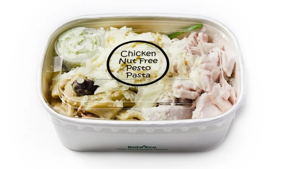 Chicken Pesto Pasta Salad: Chargrilled chicken, rocket, pasta, nut free basil pesto mayo, Kalamata olives, semi dried tomato, parmesan cheese. Serving Size: 240g. Store at: Store Refrigerated at or Below 5 degrees celcius. Shelf Life: 3 days. ALLERGENS: Contains Egg,Contains Gluten,Contains Milk,Contains Soy,Contains Wheat
