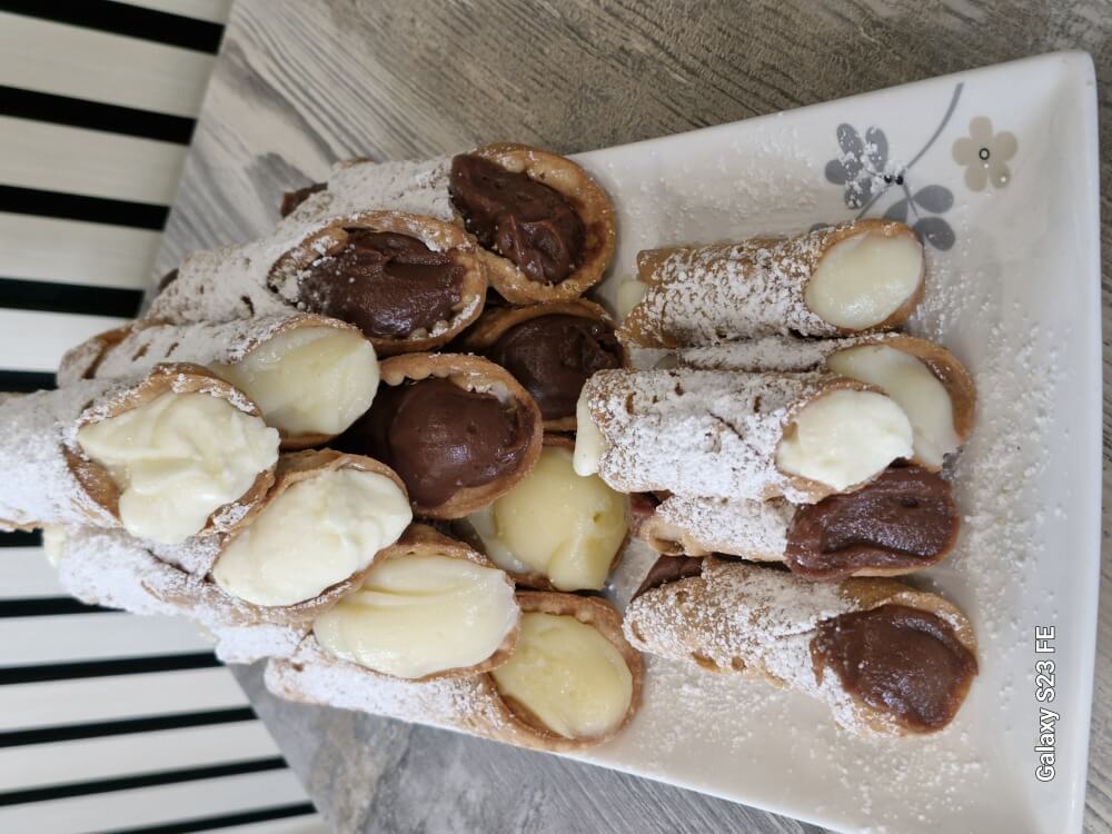 Freshly prepared Italian Cannolis Vanilla, Chocolate, Ricotta custard large $5 each.