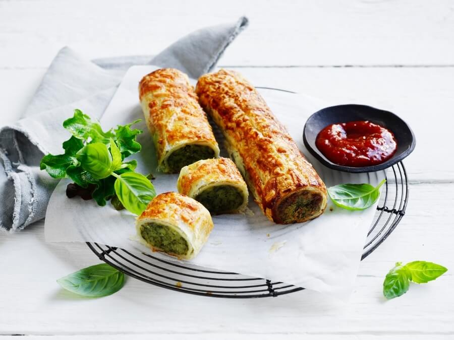 Potato roll stuffed with a crispy bubble and squeak patty or a savory veggie patty.