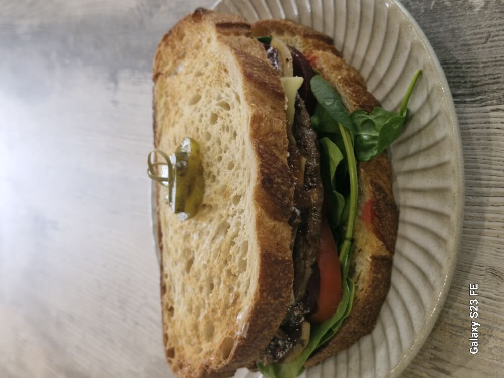 Juicy steak fillet on a delectable sandwich with lettuce, tomato, sprinkled onion, and sweet beetroot.