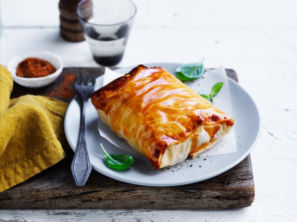 Spinach and feta pie paired with crisp lettuce, shredded carrots, juicy tomato, cucumber, and red onions.