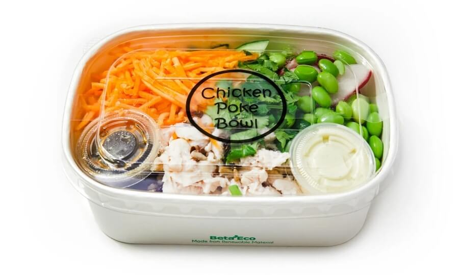 Poke Bowl Salad -Chicken breast, mixed quinoa, brown rice, shredded purple & green cabbage, edamame beans, cucumber, carrot, pink radish, coriander, shallots, toasted seeds, shoyu dressing, wasabi mayo. Serving Size: 465g, Store at: Store Refrigerated at or Below 5 degrees celsius, Shelf Life: 3 days