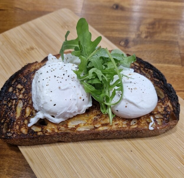 Crispy bacon, fresh baby spinach, two poached eggs, and a flavorful sauce on hearty sourdough bread.